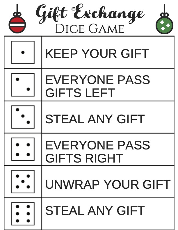 Here is a printable version of the Gift Exchange Dice Game rules: